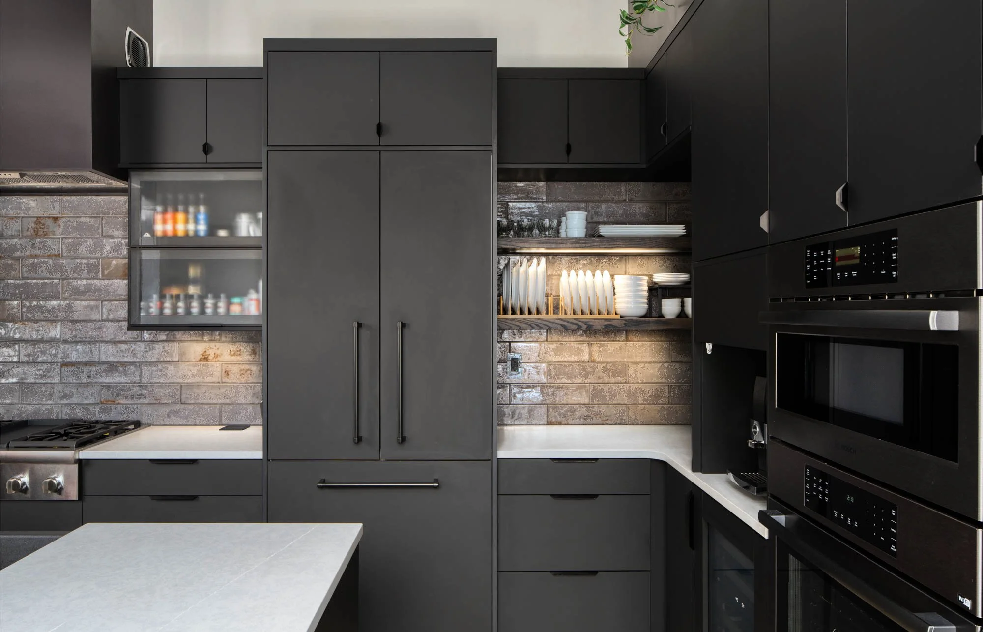 Via Design reworked the kitchen layout to improve flow and functionality, replacing the original peninsula with a central island and integrated bar area. Custom matte black cabinetry by CLEO establishes a bold, modern aesthetic, complemented by layered materials and refined finishes throughout the home. Additional updates to the fireplace, bathrooms, closet, and laundry spaces create a cohesive environment that reflects the owner’s personality while enhancing the architectural character of this downtown Grand Rapids condo.